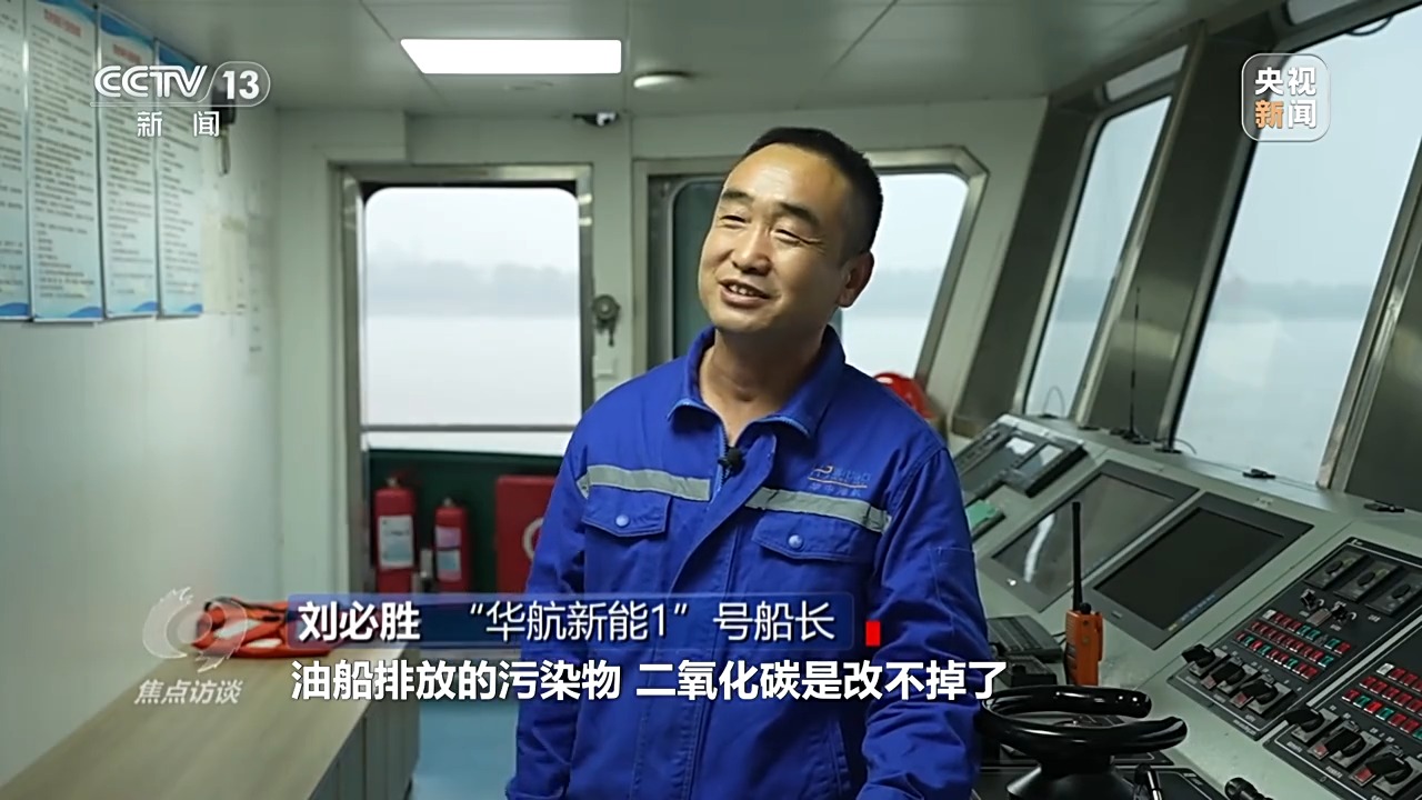 “华航新能1”号船长 刘必胜:油船排放的二氧化碳改不掉,经常吸到,油烟对身体健康有影响。开油船噪声大了,电船没有声音,很安静,有一种舒适感,外面发生船舶动态,海事提醒,我们都可以清楚地听到。
