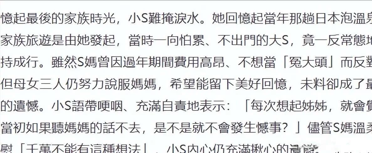 不过毕竟这个事情也已经到了今天的这一个地步再后悔也没有什么用了,毕竟事情已经发生了大S也已经离开了一年多的时间,现在的小S也是比较敞开心扉地说出自己之前的一些痛,要不然她也不会说出来的。