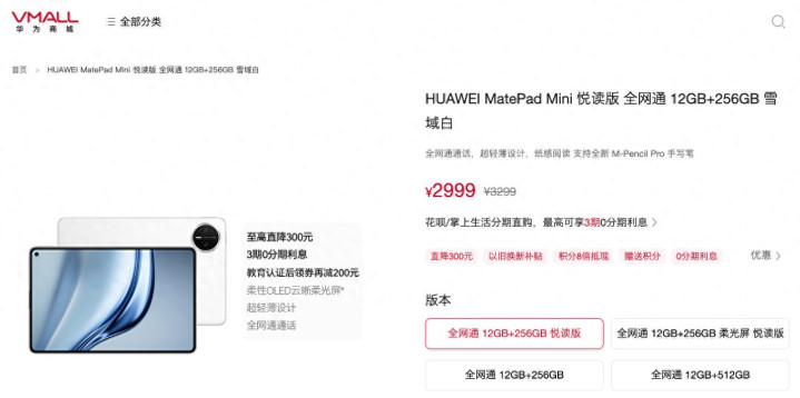 根据华为官网信息显示,MatePad Mini 悦读版全系降价 300 元,现到手价来到了——